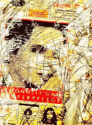 Beschreibung: Technik des Künstlers Jiří Kolář: Bilder werden in kleine Stücke geschnitten oder gerissen und dann chaotisch, überlappend und willkürlich wieder zusammengesetzt.