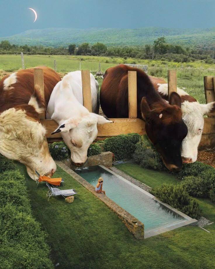 Kombiniere die Bildelemente so, dass eine ungewöhnliche, witzige oder nachdenkliche Wirkung entsteht.