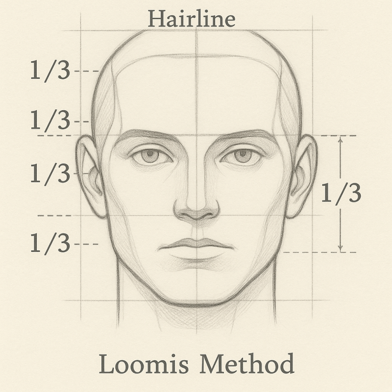 Proportionen in Drittel unterteilt (Haaransatz – Augen – Nase – Kinn)