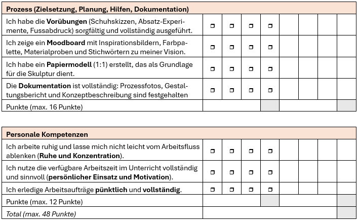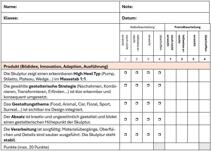 Du gestaltest eine kreative, ungewöhnliche High Heel Skulptur im Massstab 1:1. Dabei kombinierst du handwerkliches Geschick mit deiner künstlerischen Vision. Der Schuh soll nicht tragbar sein – es geht um die künstlerische Auseinandersetzung mit Form, Funktion und Ästhetik.