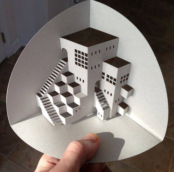 Gestalte komplexe Treppen in der Parallelperspektive. Diese Darstellungsart täuscht in einem zweidimensionalen Bild eine nichtvorhandene Tiefe vor und ist eine optische Täuschung.
