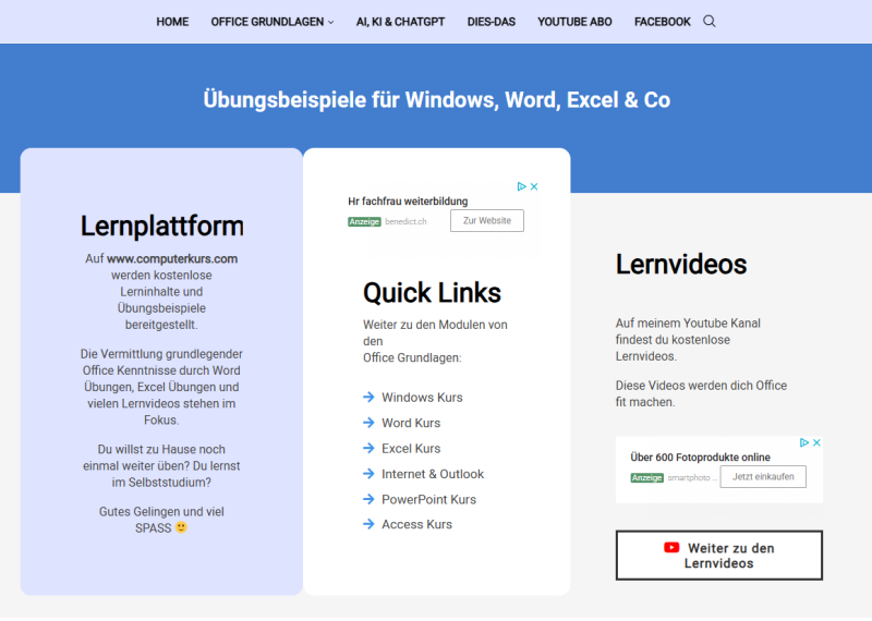 Wir arbeiten mit der kostenlosen Lernplattform «Computerkurs.com» von Christoph Grill. Die Lerninhalte werden mit eigenen Übungen ergänzt.