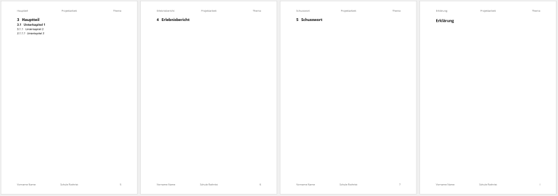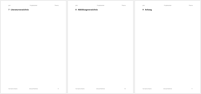 - Weise allen vier Titeln der Beilagen (Erklärung, Literaturverzeichnis, Abbildungsverzeichnis und Anhang) die Formatvorlage «Überschrift 1 ohne» zu.