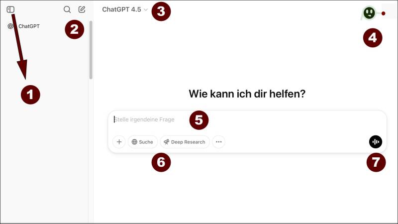 - Die Seitenleiste: Diese kannst du auf- und zuklappen. Hier findest du deinen Chatverlauf, die verschiedenen GPTs, die du erstellt hast und deine Projekte. Was das alles ist und wie du es benutzen kannst, erfährst du weiter unten.